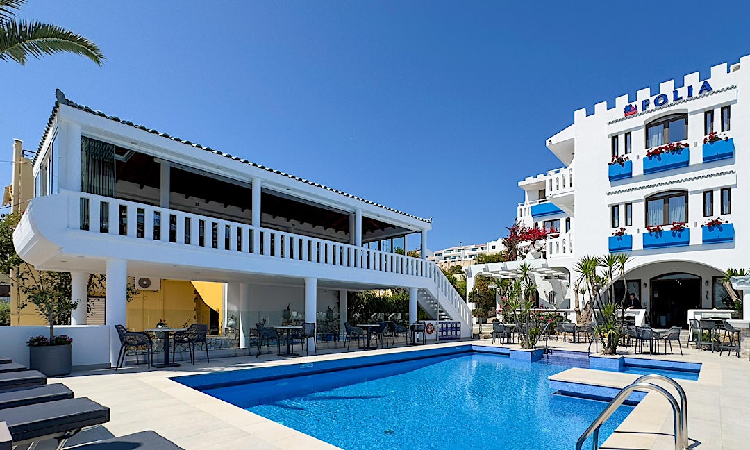 Det familiedrevne Hotel Folia ligger i Agia Marina på Kreta. Her kan du kjøle deg ned i bassenget og hvile deg på en solseng under parasollen.