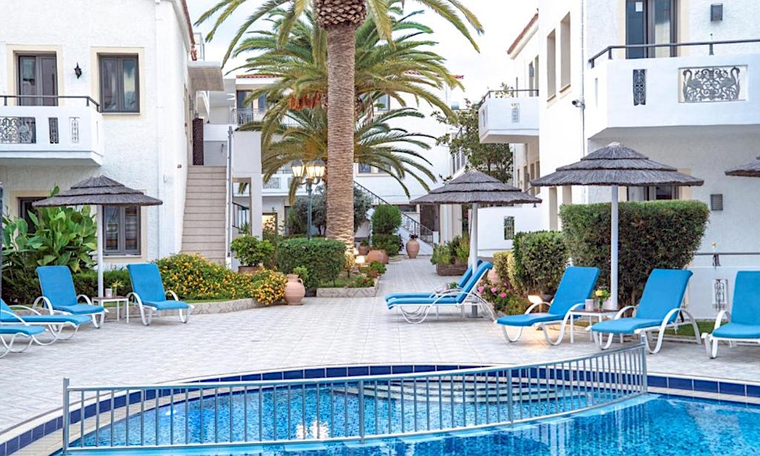 Leilighetshotellet Flamingos Hotel ligger i det rolige ferieområdet Agii Apostoli på Chania-kysten på Kreta. Du kan gå til sandstranden på noen få minutter, og bassenget byr på en forfriskende dukkert på varme dager. Her kan hele familien ha det hyggelig sammen!