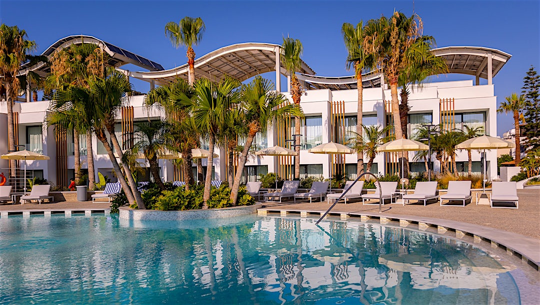 Like nedenfor hotellet ligger Oroklini Beach, en liten strand med sand og småstein der du kan ta avkjølende dukkerter i havet.